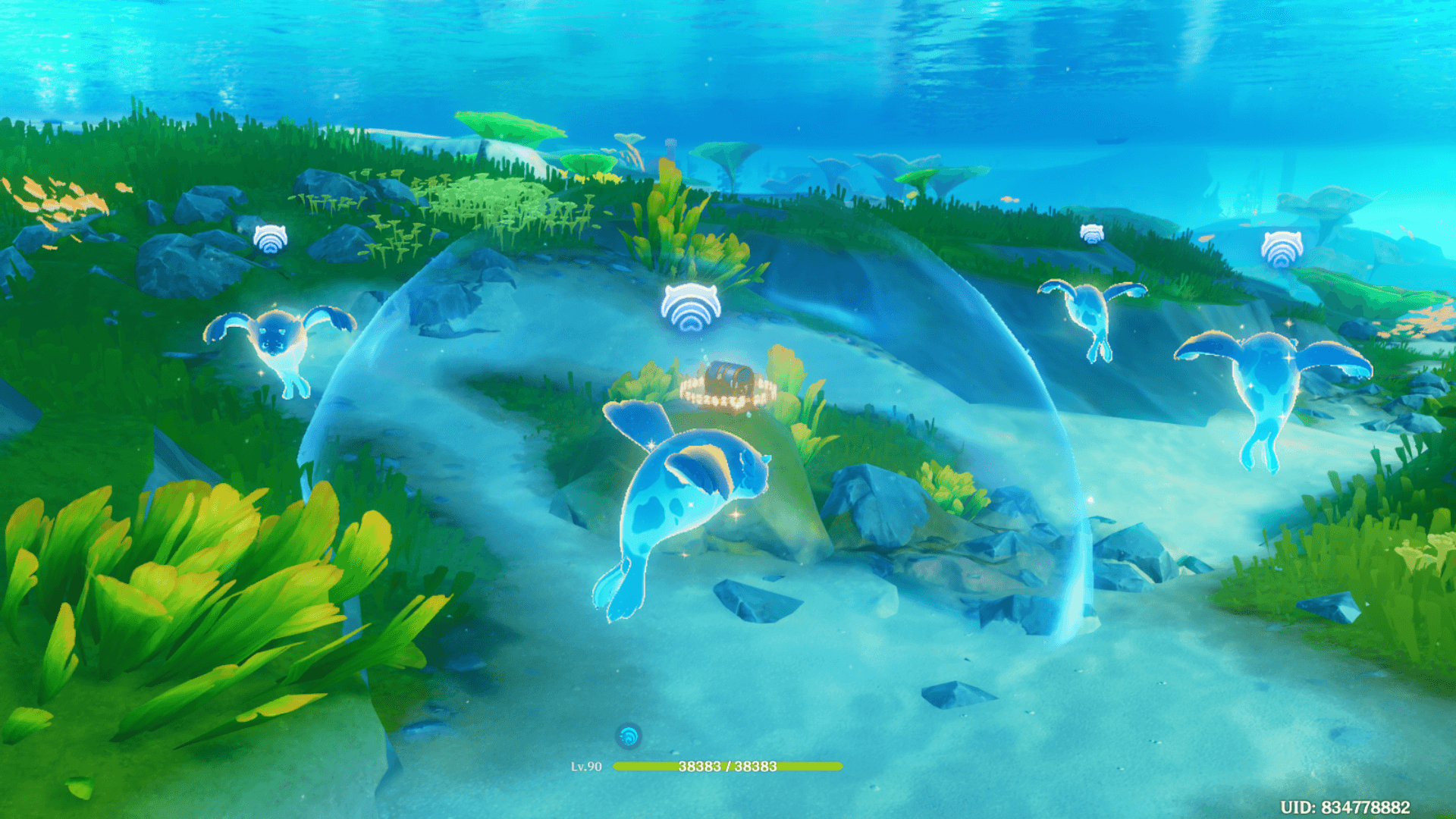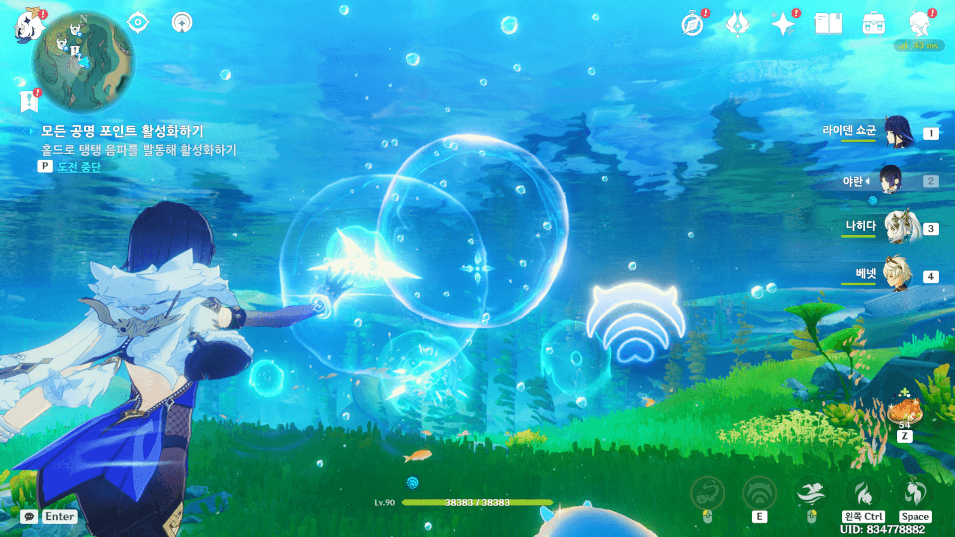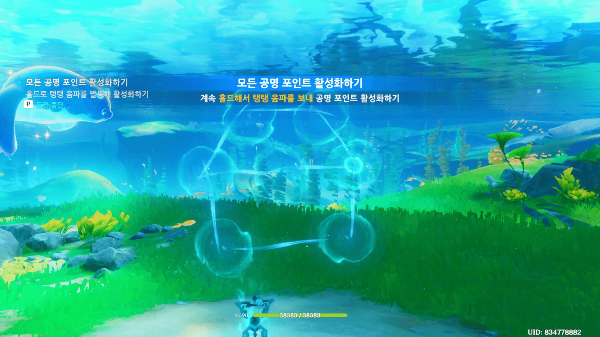 다시 플레이어의 화면으로 돌아오면 음파가 하나밖에 보이지 않는다. 이 음파를 이용해 각 지점을 유추하여 물범의 음파 능력을 난사해주면 된다. (솔직히 골고루 막 쏘다보면 클리어한다.)