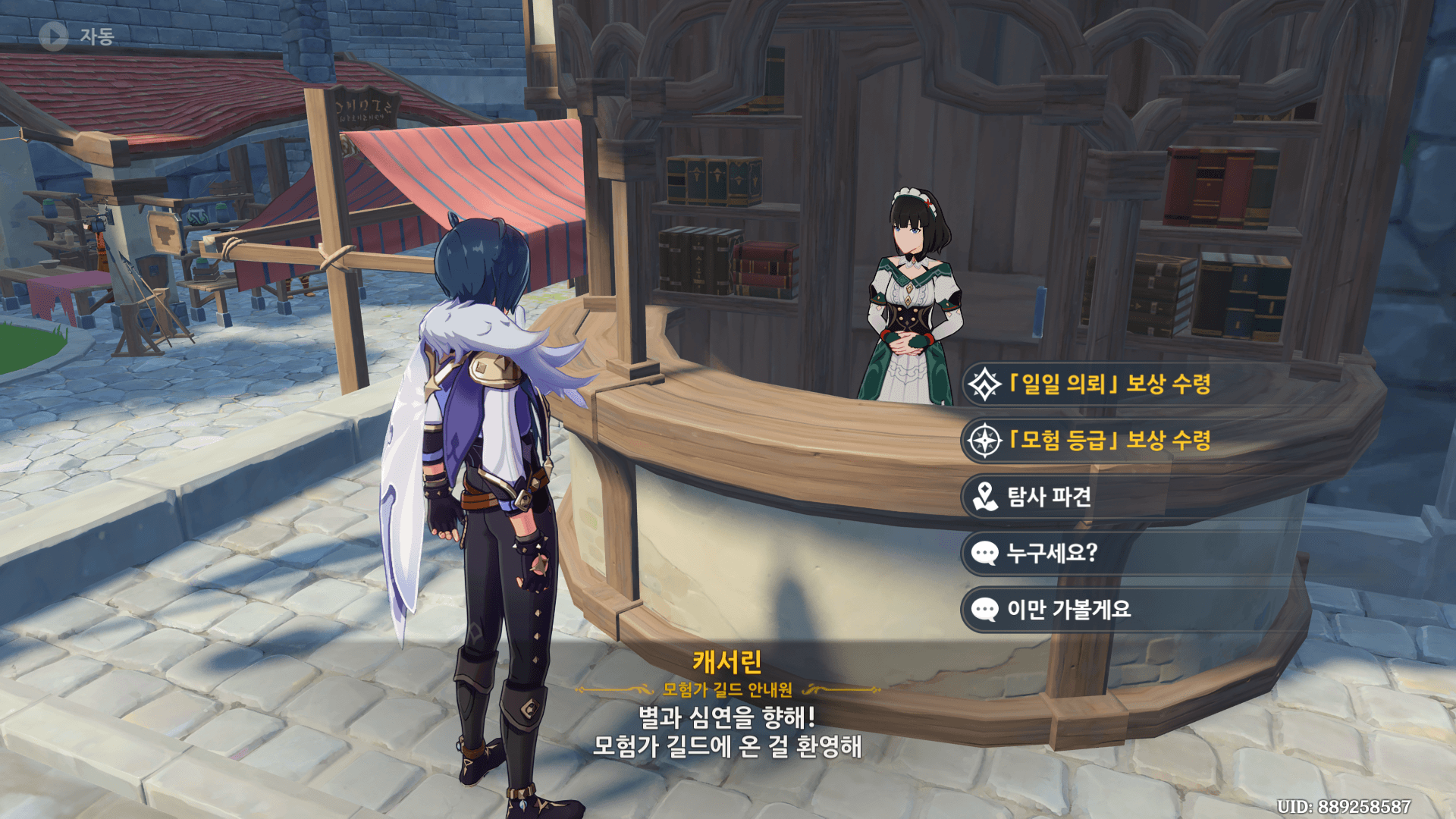 탐사 파견은 모험가 길드의 <캐서린>에게서 언제든지 확인할 수 있습니다.